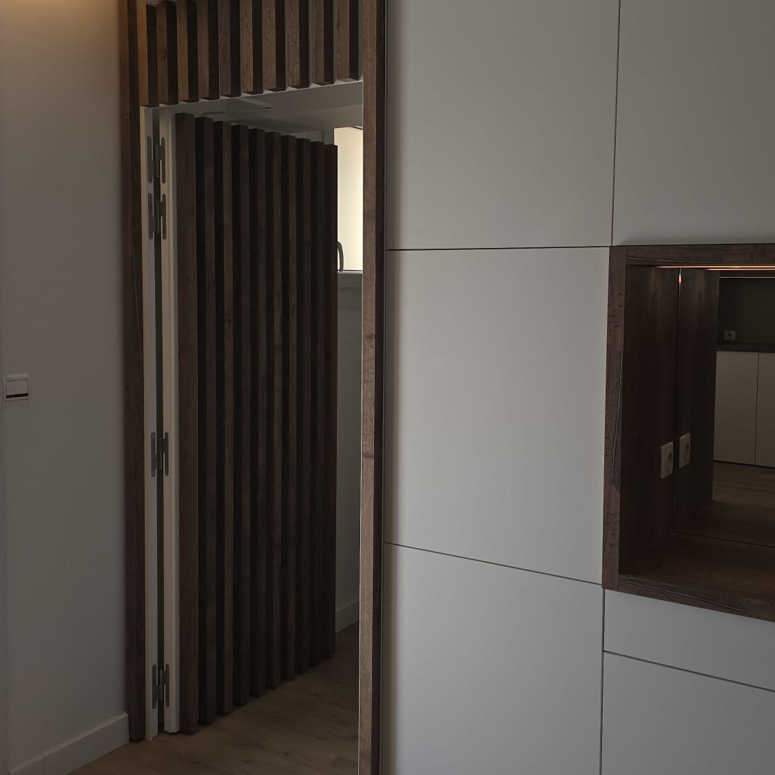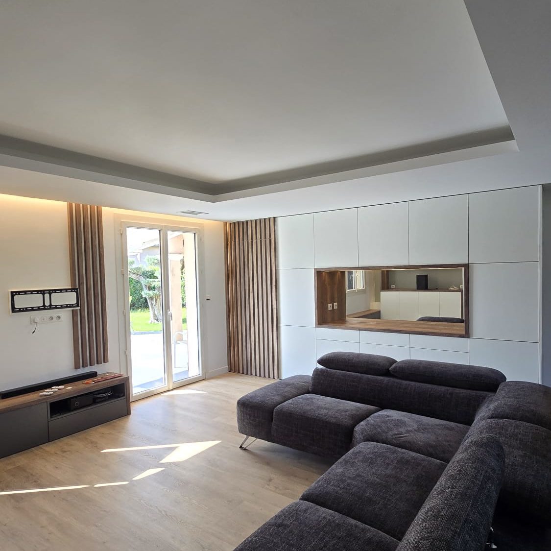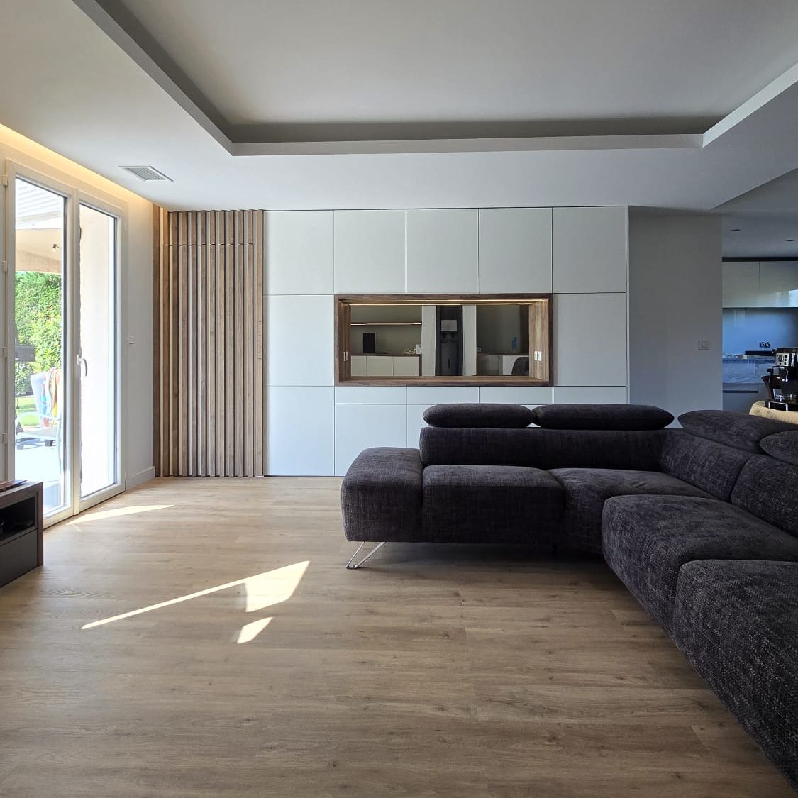 Aménagement d’une pièce à vivre avec de nombreux rangements sur-mesure.