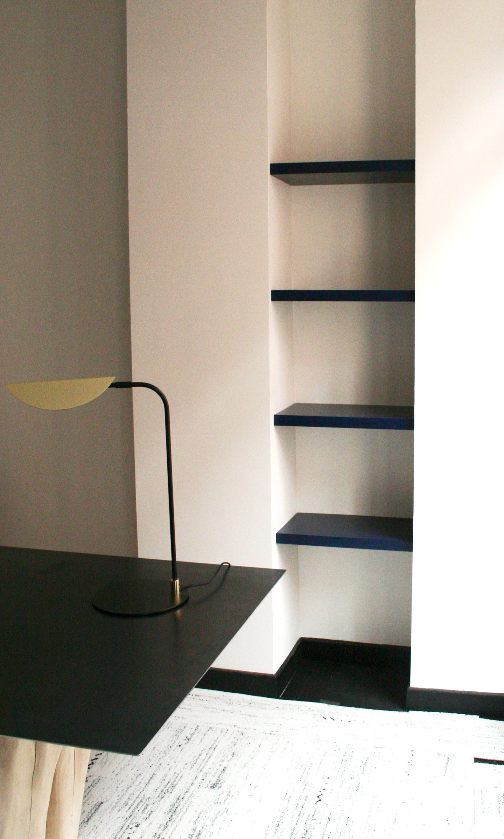 Réalisation de placards intégrés en panneaux finition chêne et laque bleu. Aménagement d’étagères invisibles.